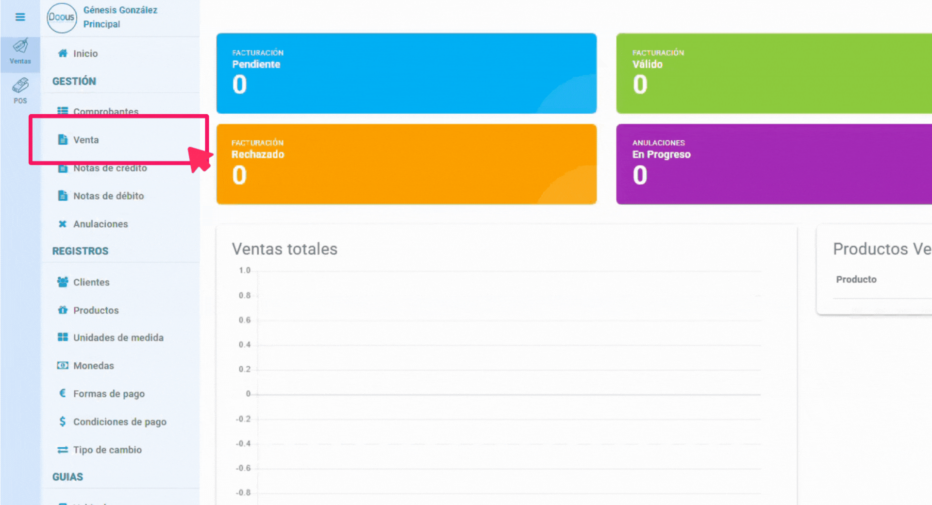 Desde el panel principal, selecciona la opción “Ventas” para comenzar a crear tu comprobante.