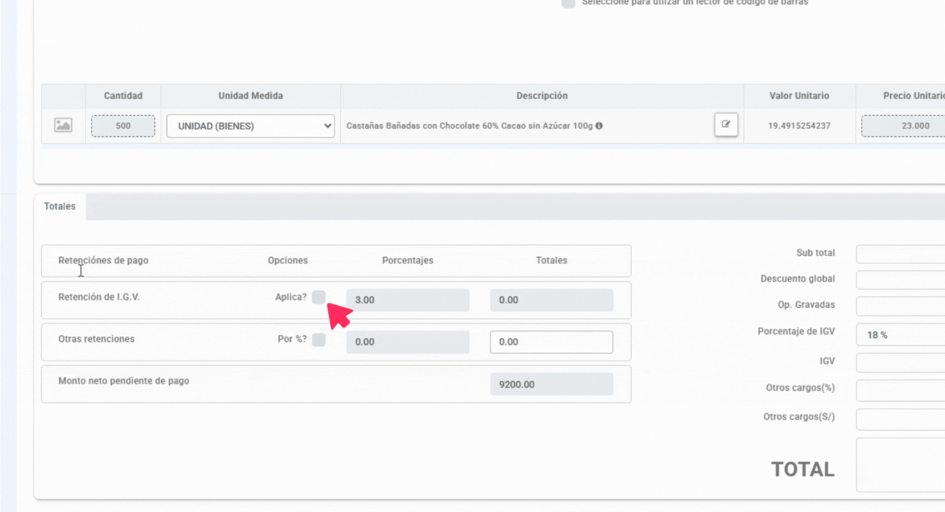 Marca esta opción para que el sistema calcule automáticamente el importe retenido (3% del total afecto al IGV, según el régimen general).